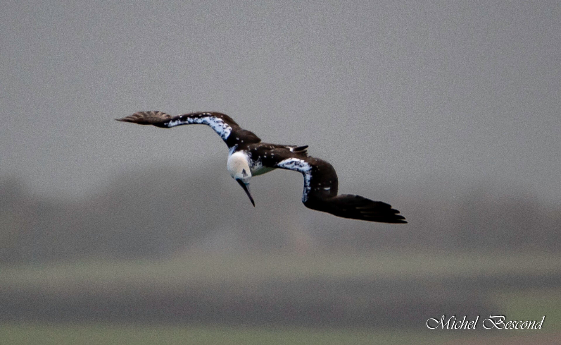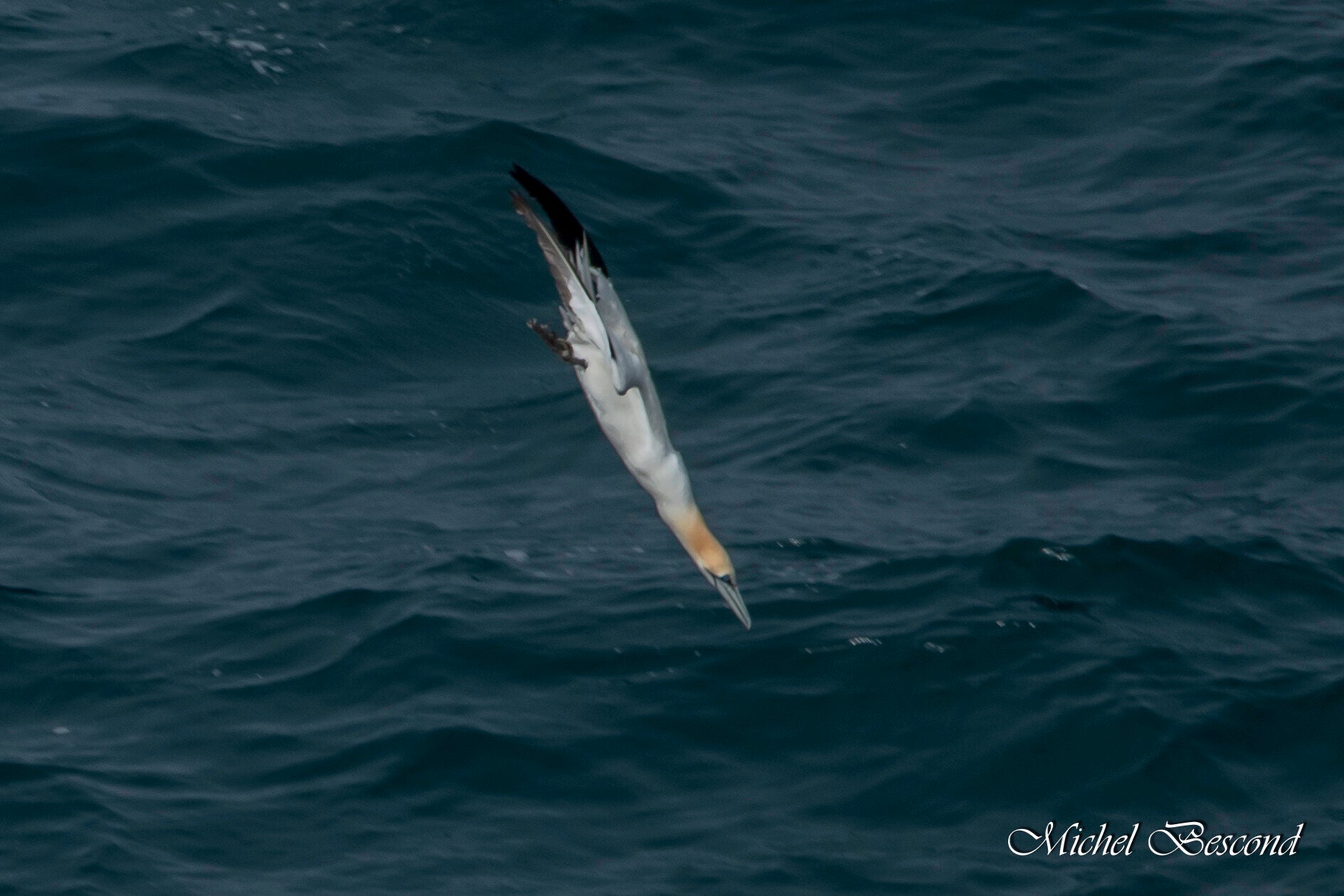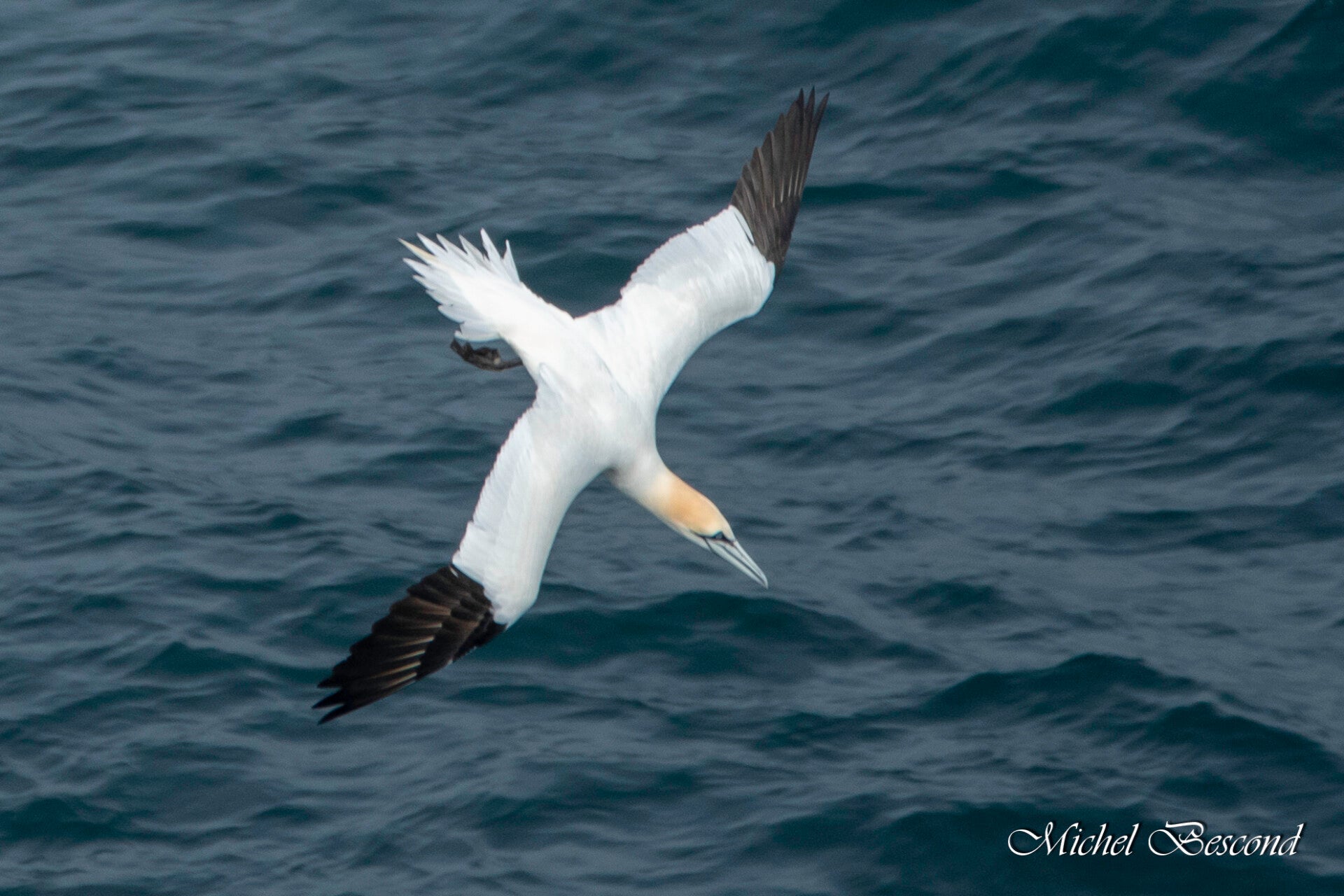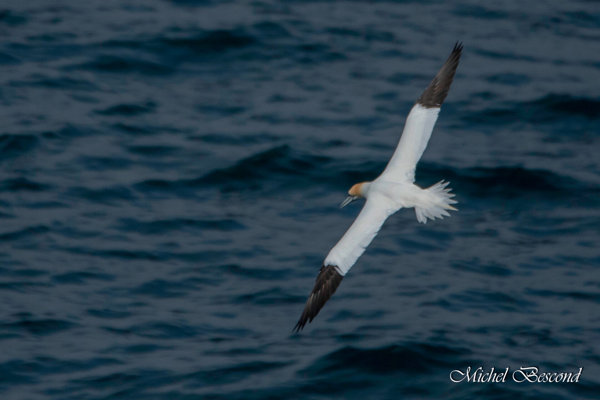 Le fou de Bassan, ce voltigeur de grande envergure allant jusqu'à 1,80 mètre, est le plus grand oiseau de mer d'Europe. Les tempêtes de l'hiver les rapprochent des côtes du Cap-Sizun, on peut ainsi les observer de plus près. Ils peuvent repérer des bancs de poissons jusqu'à une hauteur de 40 mètres et plonger à près de 90 km/h jusqu'à une profondeur d'une quinzaine de mètres en restant immergés environ 20 secondes. Le Fou de Bassan a payé un lourd tribut lors de l'épidémie de grippe aviaire de 2022 : environ 80 % des poussins de l'année seraient morts, et de nombreux adultes seront retrouvés morts tout le long du littoral. Un fait étonnant s'est produit suite à cette épidémie : le Fou va-t-il perdre ses beaux yeux bleus ? En effet, chez les individus guéris de la grippe, l'iris de l'œil passerait du bleu au noir, observé aussi sur des juvéniles. La question de la transmission de la colorisation noire de l'iris se pose, une étude est en cours sur ce phénomène. Espérons le voir encore longtemps, cette grande silhouette blanche se découper sur le ciel noir de tempête et plonger le long de nos rivages.